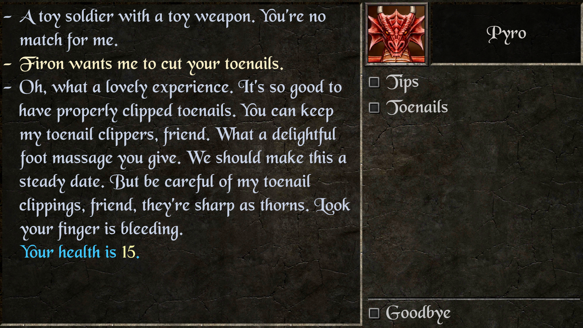 > This may need a fix if you bought the toenail clippers in a store and tapped the brazier before you talked to Pyro. Not sure yet. See if having the exact numbers of items works for you. Drop any extra if you have extra. If that doesn't work, I'll do a fix but let me know. Thanks.