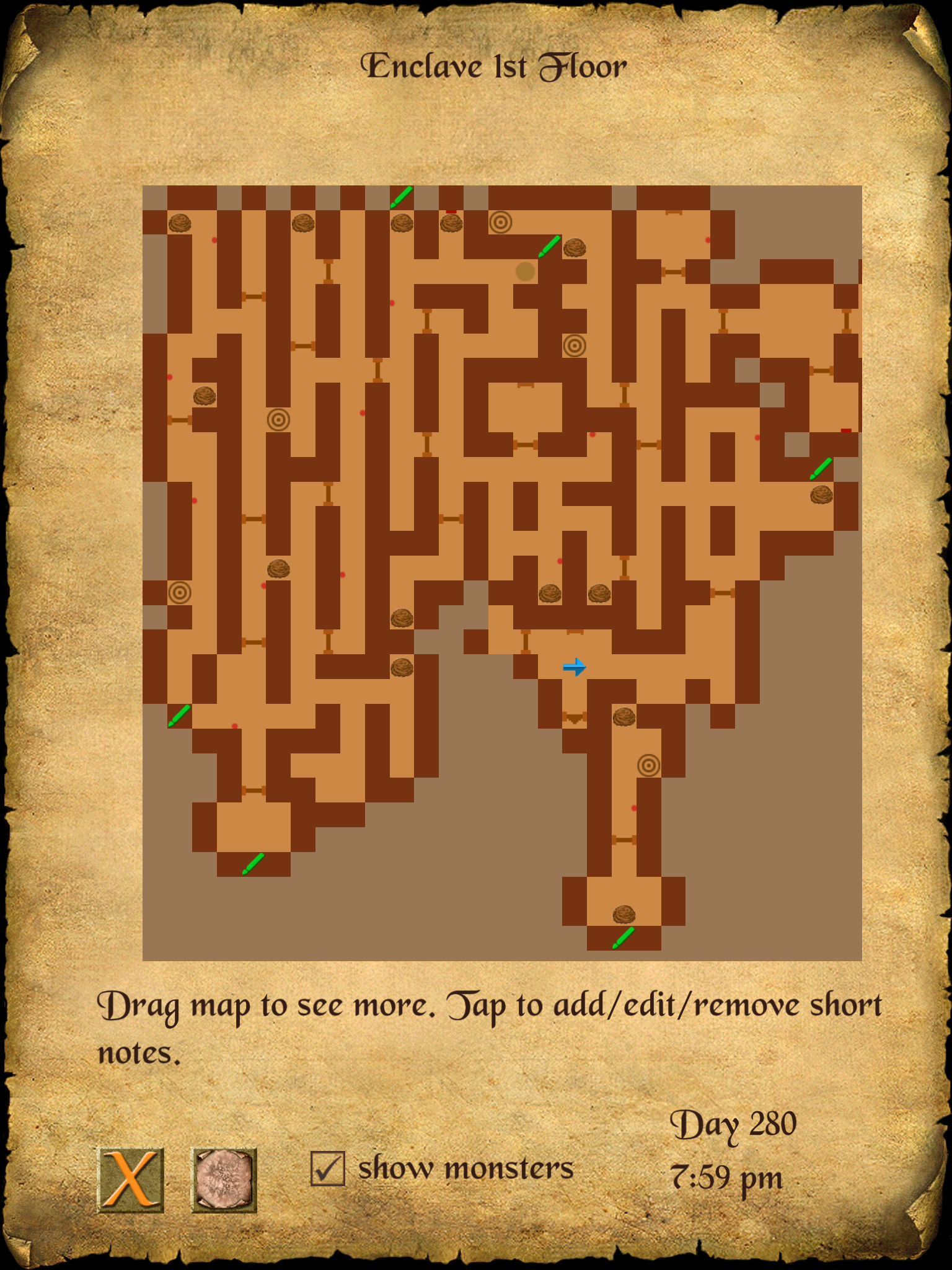 • You are standing in the area I can’t get into as it requires pushing switches/killing sceletons. I have attached my map below with 5 of 6 switches marked with the green pen - the 6th is in the area below the edge of the map on the bottom.