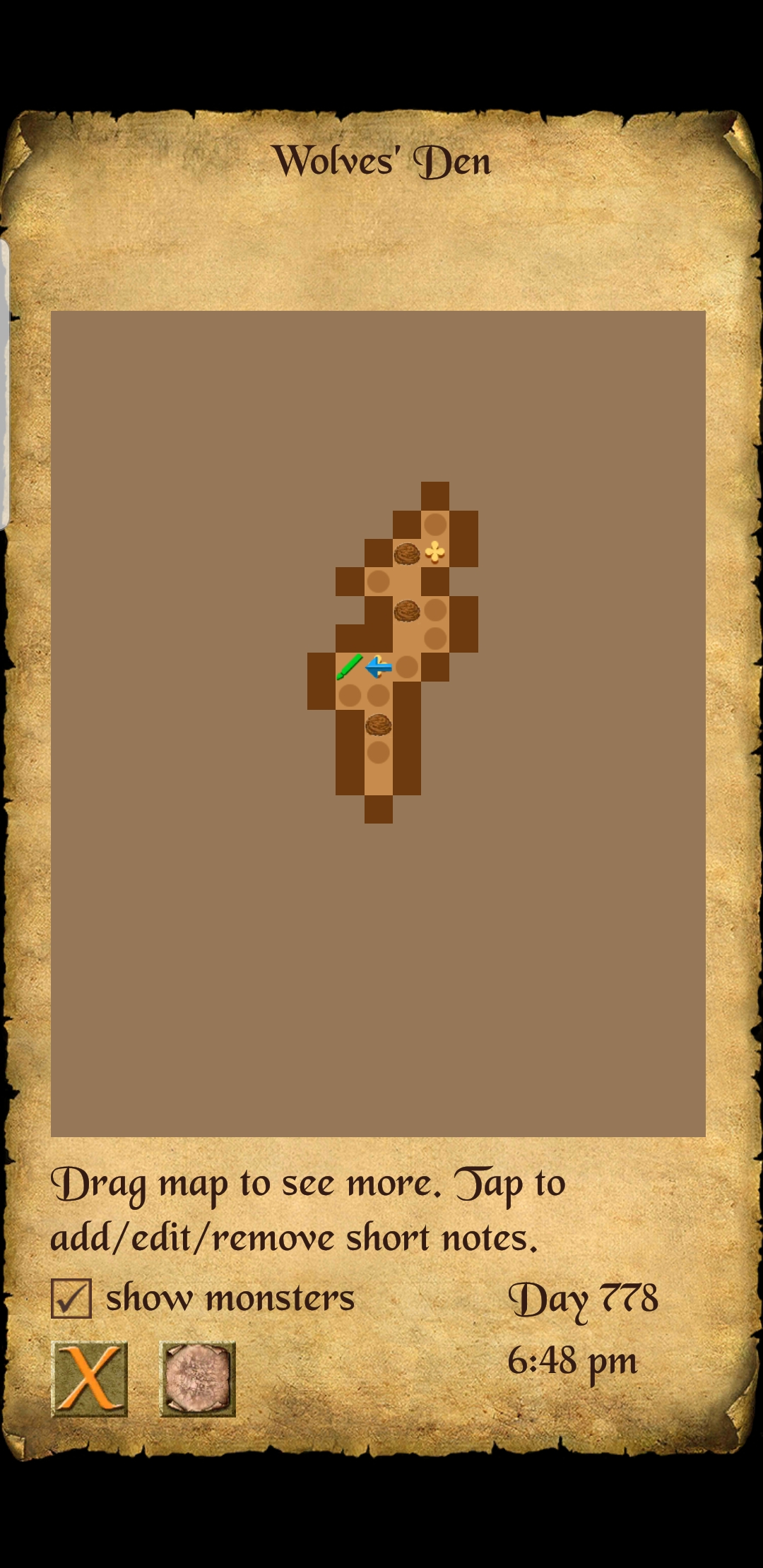 That map up at the top here is the map of the Wolves' Den. Doing a riddle for the friendly wolves removes a wall. You can tell which wall by the white square.